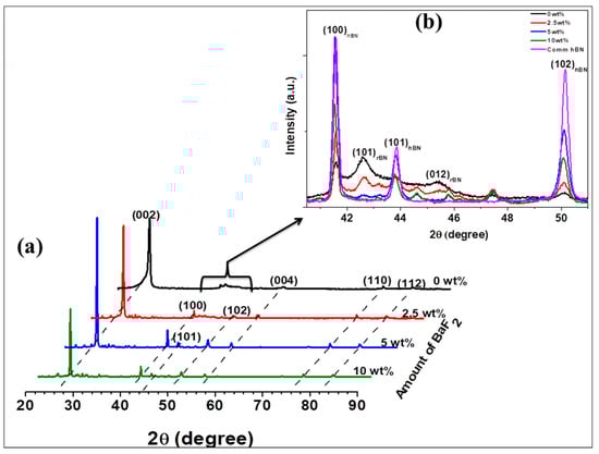 (a,b) XRD patterns for BNNS samples annealed at 1200 °C after the addition of 5 wt% Li3N together with 0–10 wt% of BaF2.