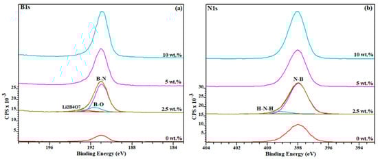 High-resolution XPS spectra showing a deconvoluted peak of (a) B1s, and (b) N1s for all hBN nanosheet samples after the addition of 0–10 wt% of BaF2.
