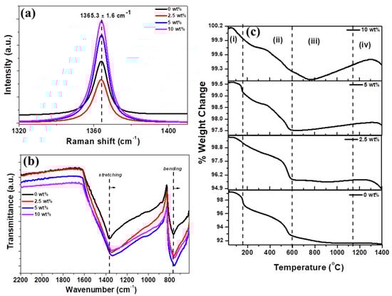 (a) Raman spectra, (b) FTIR spectra, and (c) TGA profiles for BNNS samples annealed at 1200 °C after the addition of 5 wt% Li3N and 0–10 wt% BaF2.