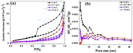 Surface area and pore-size distribution of hBN are essential properties for its potential application in energy storage and conversion devices as well as in biotechnological applications. As such the specific surface area (SSA), pore-size distribution of the as-synthesized hBN samples were determined using the multi-point Brunauer–Emmet-Teller (BET) method through adsorption/desorption measurements of N2 at 77K. From the N2 adsorption/desorption isotherm curves (Figure 4a), the hBN synthesized with the addition of BaF2 demonstrated a type II isotherm with increasing BaF2 content; an indication of the formation of macroporous or non-porous materials []. Minor N2 amounts were adsorbed under relatively lower relative pressures (P/P0 < 0.01) for all samples, with no hysteresis loop being observed under low pressure (P/P0 < 0.45); an indication of the absence of micropores and mesopores on the materials’ surface. Interestingly, the hysteresis loop was observed to decrease between adsorption/desorption under higher pressures (P/P0 > 0.45) with increasing BaF2 content. Thus, the physical adsorption mechanism on the as-synthesized hBN samples can be described as follows: without BaF2 content (i.e., 0 wt.%), the N2 adsorption is a formation of an unrestricted multilayer after the completion of a monolayer, followed by delayed desorption of N2. Thus, this accounts for the high specific surface area recorded for the 0 wt.% BaF2 hBN sample (~8.7 m2/g), which can then be attributed to the presence of a relatively small amount of macropores (Figure 4b) and/or the external rough surface [,]. On the other hand, with the addition of BaF2 content, the adsorption mechanism can be presumed to be following the adsorption and desorption of the monolayer of N2 onto the material’s external rough surface of the basal planes due to the non-porous morphology of the samples. This is shown by the adsorption curve which does not reach a plateau at a relatively high pressure close to unity (P/P0 ∼ 0.99), but rather extends indefinitely. Therefore, based on the multi-point BET method, the specific surface areas for the samples were then determined from the BET plots extracted using points between 0.05 < P/P0 < 0.30 (Figure S4) and these were found to be 8.7, 3.5, 3.6, and 2.9 m2/g for samples prepared after addition of 0, 2.5, 5, and 10 wt% of BaF2, respectively. Table S2 gives a summary of the textual properties of these samples.