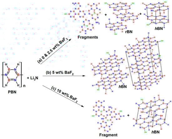 However, for hBN to reach its ultimate practical application in the optoelectronic and dielectric industry, synthesis of large-area high-quality single crystals of hBN, at cost effective conditions, is a very crucial issue. Consequently, numerous techniques have been developed and employed to produce hBN; these include processes such as mechanical exfoliation [,,], sputtering [,], pulsed laser deposition (PLD) [,], atomic layer deposition (ALD) [,,], and chemical vapor deposition (CVD) [,]. For instance, with graphene, mechanical exfoliation has been widely used to produce high-quality hBN nanosheets. On the contrary, mechanical exfoliation is strictly limited to the fabrication of small-scale devices as the process produces flakes of a limited size, inconsistent yields, and a variable number of hBN layers. Additionally, other techniques basically require extremely sophisticated equipment using high temperatures and pressures []. Therefore, in an attempt to circumvent these drawbacks, the use of the polymer derived ceramics (PDCs) [,,,,] process coupled with the addition of a crystallization agent such as lithium nitride (Li3N) has been reported to provide an alternative approach for preparing large-scale and high-quality single crystals of hBN nanosheets for further applications in next-generation electronics. During the PDCs method, a polymeric precursor is synthesized from its monomers, after which it is then converted into ceramic after shaping. Among the various precursors that have been used for the PDCs-synthesis of hBN nanosheets, polyborazylene (PBN) has shown to lead to the production of large-area highly crystallized hBN at temperatures as low as ~1400 °C [,,,,]. This is owing to its relatively high ceramic yield and high purity. Most importantly, the B/N ratio within PBN polymer is ideal to produce stoichiometric hBN, with the only contaminants being hydrogen atoms that are easily removed during the ceramization step. Despite the synthesis of large-area and well-crystallized hBN nanosheets via the conventional PDCs process, the search for further improvements so as to synthesize well-crystallized hBN nanosheets at relatively lower sintering temperatures, still remains a paramount necessity and occupies the activity of today’s scientific community. One such technology, which has been overlooked for almost a decade, is the use of halides in combination with lithium nitride (Li3N) []. In this process, the Li3N acts as a crystallization promoter to produce highly crystallized hBN, whereas the halides help to facilitate the melting of Li3N, leading to the synthesis of hBN nanosheets at temperatures as low as ~800 °C at a prolonged time of 22–56 h. As such, this work reports on the use of PDCs process coupled with Li3N-additives in combination with the group II halides, in particular, barium fluoride (BaF2), to produce large-area well-crystallized hBN nanosheets at low temperatures. The work provides a new platform for the large-scale synthesis of hBN nanosheets at cost-effective conditions without compromising the physicochemical properties of hBN nanosheets.