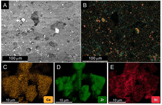 Figure 1 shows the results of a study by Scanning Electron Microscopy (SEM) of the distribution of the catalyst over the monolith walls. After observing different areas of several coated monoliths, two important features are worth being highlighted: (1) The catalyst grains are efficiently spread out over the available surface, in the form of a discontinuous, patchy like, layer, Figure 1A. Though their size is varied, no large accumulation of the active phase takes place. Moreover, as revealed by the X-ray Energy Dispersive (EDS) maps, Figure 1B–E, the grains correspond to the Ni/CeO2/ZrO2 powder; (2) the three elements in the active phase keep in tight contact after deposition by washcoating onto the monolith. Particularly, Ni is well dispersed over the ceria-zirconia support.