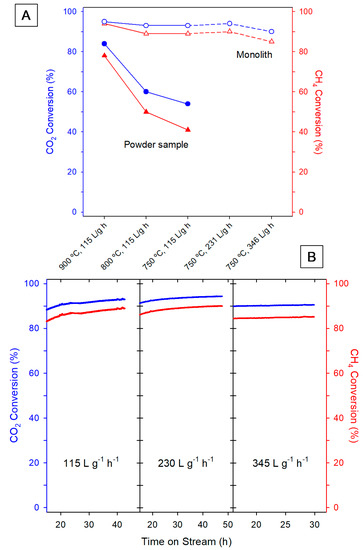 Catalytic activity tests in the DRM reaction for a 1:1 mixture of pure CH4 and CO2 were carried out in the temperature range 750–900 °C, under Weight Hourly Spatial Velocities (WHSV) from 115 up to 346 L·g−1·h−1, and for Time on Stream (TOS) values between 24 and 48 h. The latter were selected to operate under steady-state conditions considering the endothermic character of the reaction, so avoiding differences in temperature transients between powdered catalytic beds and monolithic reactors. More details can be found in the Supplementary Materials section.