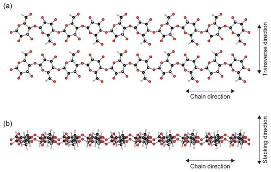 Figure 2 gives schemas of the cellulose Iβ structure observed along two directions. Cellulose sheets composed of the flat ribbon-like chains are stacked in parallel. Because of technical difficulties, direct thermal conductivity measurement of cellulose Iβ single crystals has not been reported to date. However, a prediction by molecular dynamics (MD) simulations was reported recently [48]. According to the MD simulations, the thermal conductivity in the chain direction was predicted to be around 5.7 W·m−1·K−1 at 300 K. When compared with the ultra-drawn polyethylene nanofibers, the value is not very high. But it is significantly higher than those of usual organic polymers. The thermal conductivity values in other directions are predicted to be less than 1 W·m−1·K−1. In the transverse direction, the cellulose sheets are stabilized by a network of hydrogen bonds [49,50]. In the stacking direction, the inter-sheet stability can be attributed to out-of-plane van der Waals interactions between the backbone ring structures [51]. The weak bondings or interactions would result in a lower thermal conductivity along the two directions. Thus, the inherent heat transfer capability of cellulose Iβ relies on phonons traveling along the chain direction in its crystal structure.