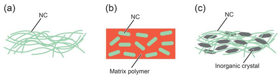Owing to their high aspect ratio and extensive hydrogen bondings, films consist of an interconnected and entangled CNF network structure have an ability to sustain mechanical stress [64,65]. The films have remnant porosity from the gaps within the CNF network. Many attempts to enhance thermal conductivity by embedding inorganic crystallites in the pores have been reported. In the scheme, CNFs retain outer shapes and mechanical flexibility of the composite materials without impairing thermal conductivity of the inorganic crystallites heavily. To the authors’ knowledge, that can hardly be achieved with other organic polymers.
