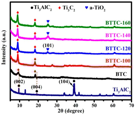The crystalline of BTC and BTTC-x samples is analyzed in Figure 2. Obviously, the diffraction peak for (104) of Ti3AlC2 raw sample at 2θ = 39° disappears after etching with HF for 25 h. Besides, the diffraction peaks for (002) at 2θ = 9.72° and (004) at 2θ = 19.18° of Ti3AlC2 are broadened and shifted to lower angle, suggesting that Ti-Al bond is broken and Ti3C2 is prepared successfully [41]. The XRD of Ti3C2 and TTC-x (x = 100, 120, 140, and 160 °C, respectively) is revealed in Figure S1. No obvious diffraction peak of anatase TiO2 can be observed, suggesting that this temperature is not conductive to generate anatase TiO2. With the increase of the hydrothermal temperature, a new peak at 2θ = 25.4° is detected for BTTC-120/140/160 compared with the BTTC-100 sample, which is attributed to the (101) crystal face of anatase TiO2 (JCPDS No. 21-1272) [40]. Meanwhile, the intensity of diffraction peak at 2θ = 25.4° increases as rising the hydrothermal temperature, which proves that more Ti3C2 transforms to TiO2 NPs. No obvious diffraction peak of BPQDs can be detected, which can be attributed to the low BPQDs-loading in the composites.