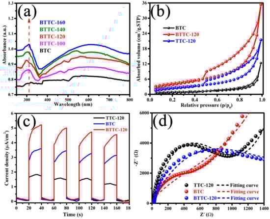 (a) UV-vis diffuse reflectance spectra (DRS) of as-synthesized BTC and BTTC-x (x=100, 120, 140, and 160 °C, respectively); (b) N2 adsorption-desorption isotherms of the as-prepared BTC, TTC-120, and BTTC-120 powders; (c) Photocurrent response and (d) electrochemical impedance spectra of BTC, TTC-120, and BTTC-120.