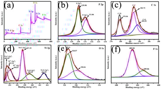 (a) XPS survey spectra and high resolution XPS spectra of (b) P 2p, (c) C 1s, (d) Ti 2p, (e) O 1s, (f) F 1s of BTTC-120 sample.