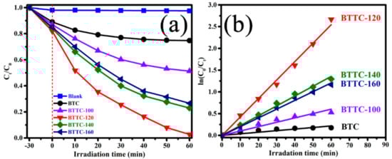 In addition, the photocatalytic kinetics of dyes are simulated by the Langmuir–Hinshelwod kinetic theory [46]. The regression curve of natural logarithm normalizes the approximate linearity between MO concentration and reaction time, suggesting that the degradation of MO follows the first-order rate constant [ln(C0/Ct) = kt, where k is the apparent first-order rate constant, as revealed in Figure 7b. The kinetics rate constants of BTC and BTTC-x (x = 100, 120, 140 and 160) are 0.01809, 0.05025, 0.21201, 0.11304, and 0.10058 min−1, respectively. The enhanced photocatalytic activity of BTTC-x samples is attributed to the intimate contact heterojunction between BPQDs and Ti3C2@TiO2 composites. Different TiO2-based composites for photocatalytic degradation of MO under visible light irradiation, as shown in Table 1.