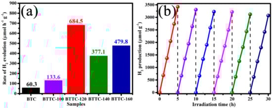(a) The photocatalytic hydrogen evolution rate of BTC and BTTC-x (x = 100, 120, 140, and 160 °C, respectively); (b) the recycling tests of BTTC-120 for photocatalytic hydrogen generation process.