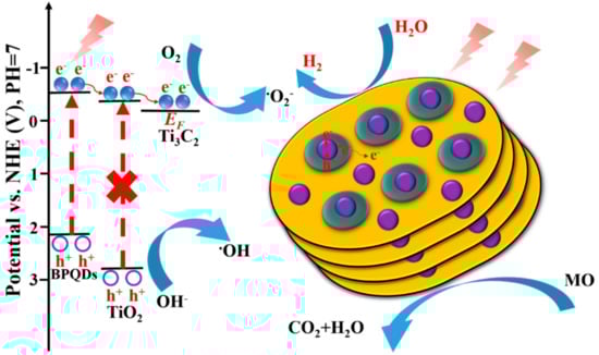 Based on the above experiment results, the photocatalytic mechanism of degradation of MO and HER of BPQDs/Ti3C2@TiO2 composites is demonstrated in Figure 10. Firstly, the BPQDs absorbs energy to produce photogenerated electrons and holes in the CB and valance band (VB), respectively. Subsequently, the photoelectrons migrate from CB of BPQDs to the CB of TiO2 NPs by intimate contact heterojunction due to the more negative potential [32]. Notably, the Ti3C2 has more negative Fermi level than the CB of TiO2, which is beneficial to the secondary migration of electrons. Photogenerated electrons can easily transfer through the TiO2/Ti3C2 interface with lower energy barrier, thus improving the separation efficiency and prolonging the recombination of photogenerated carriers [31]. On the one hand, a large number of photogenerated holes aggregate on the surface of photocatalyst with powerful oxidation ability, reacting with the adsorbed hydroxyl ions (OH-) and water to generate hydroxyl radicals (•OH). On the other hand, the photogenerated electrons aggregate on the surface of Ti3C2, which reacts with absorbed O2 and H2O to produce superoxide radicals (•O2−) to oxidize MO molecules [39]. In the photocatalytic hydrogen production process, the accumulated electrons react with the absorbed H+ on the surface of Ti3C2 to generate H2 [30]. The remaining holes at VB are consumed by sacrificial agent, which eliminates the factors affecting the generation of new electron. Eventually, the photocatalytic activity of photocatalytic degradation and hydrogen evolution reaction is enhanced obviously.