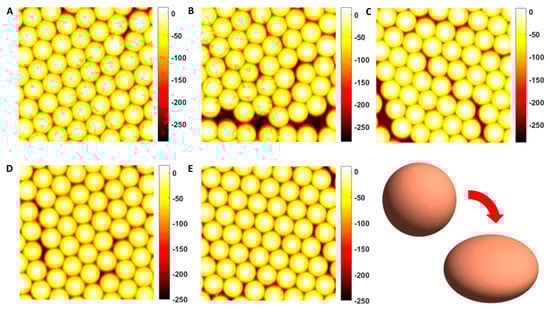 Figure 1 shows AFM images of particles for variable fluence  (the different fluence values are indicated with letters A–E as reported in Figure 2). A preliminary visual inspection apparently suggests a preservation of a nearly circular shape in the projection, but reveals a progressive decrease in the total height range of the image and the appearance of a sort of necks between neighbouring particles which becomes more evident for increasing .