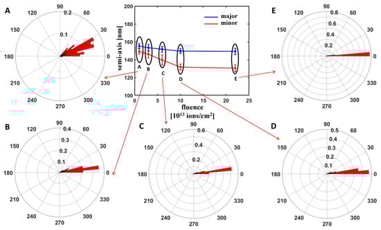Characterization of the deformation of irradiated colloidal particles for variable fluence by fitting with quadratic surfaces: major/minor semi-axis length and polar histograms showing the probability distribution of the orientation of the angle α formed between the minor semi-axis and the normal to the substrate surface (the different fluence values are indicated with letters A–E).