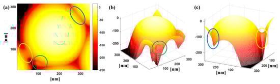 Furthermore, the approach could be applied to the description of the morphology of the upper surface of particles deformed in a way that strongly departs from a regime of preservation of point symmetry, as is the case, for instance, of particles subject to ion irradiation in experimental conditions such that  for which deformation occurs only in the top ion-irradiated portion of the particle [] or for the biconvex shape deformation frequently observed in case of particles undergoing reactive ion etching []. The approach could be inherently useful to assess a wide gamut of deformed particle morphologies provided that the particle size is not smaller or comparable with probe size in order to avoid potential artifacts and could be extended to other scanning probe microscopy techniques providing information on the topography of the upper part of particles, such as scanning near field optical microscopy [,,,,].