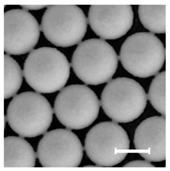 It is noteworthy to observe that formation of bridges between particles can be induced also by other particle modification techniques. To discuss this point, we have performed reactive ion etching on particles in mixed oxygen-nitrogen atmosphere as described in []. Figure 5 shows necks formed between particles that we treated with reactive ion etching. Such a phenomenon has been often observed with SEM for particles modified by RIE [,,,,]. In [], the effect has been attributed to the transformation of the singular contact point between original particles into extended contacting faces between particles and to plasma-enhanced polymer diffusion at the particle surface due to etching-induced heating at a temperature  higher than the glass transition temperature  of the particle material and promoted also by the formation of shorter polymer fragments with more efficient diffusion in comparison to the original long polymer strands under oxygen plasma treatment. Neck formation has been observed also under thermal treatment [,,].