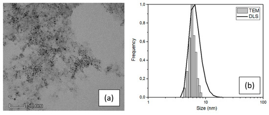 (a) TEM image and (b) size distribution of SPIONs dispersed in water obtained by TEM and DLS.