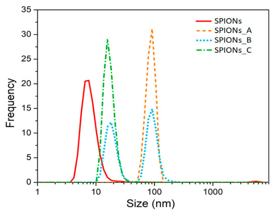 To avoid the agglomeration and to increase the amount of positively charged SPIONs, we increased the ratio between protonated cyclohexane diamines and SPIONs, first by a factor three (sample SPIONs_B) and we obtained a size distribution with two populations (see blue dotted line in Figure 2): one peak is still centered at about 100 nm and it is related to the agglomerated particles, the other peak is at about 20 nm and it is related to the positively charged SPIONs. Thus, we further increase the ratio of cyclohexane diamine to SPIONs up to 10 mmol/mg (see green line in Figure 2) thus decreasing the average size distribution up to (18 ± 3) nm.