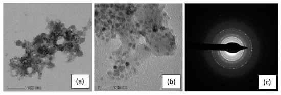 TEM images of a pSi microparticle after SPIONs infiltration at: (a) 100 nm scale and (b) 20 nm scale; (c) the SAED (selected area electron diffraction) pattern indexed as magnetite (PDF card 82–1533).