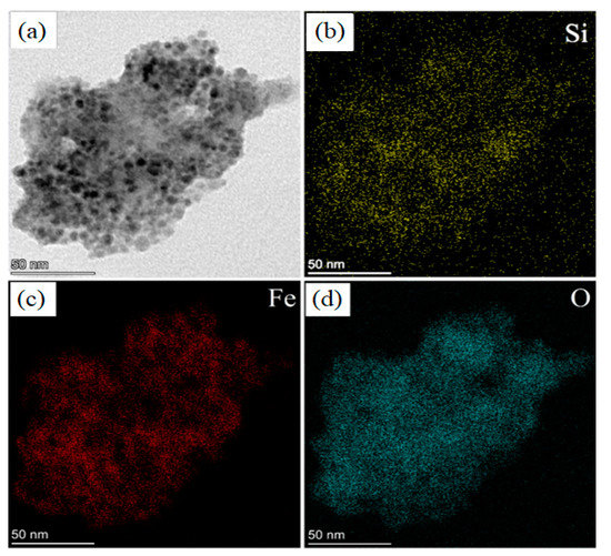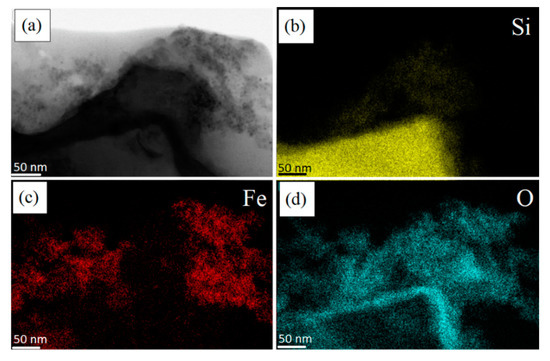 Figure 6 shows the comparison between STEM Bright Field (BF) image (panel a) and elemental maps of Si (panel b), Fe (panel c) and O (panel d). This is very convenient to understand if the SPIONs are on the porous surface: we observed a quite perfect overlap between the distribution of Si (panel b), Fe (panel c) and O atoms (panel d).