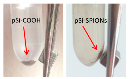 After having proved the effectiveness of the functionalization protocol and of the infiltration procedure, we looked at the magnetic properties of the “new” system. As first evidence, Figure 8 shows the proof that magnetic properties were added to the pSi microparticles by SPIONs decoration: the SPIONs decorated pSi microparticles are attracted by a magnet, differently from pSi-COOH microparticles.