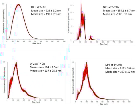 | Size stability after 48 h | Stable ~2 days 125 (± 27) nm and 366 (± 65) nm | Large Agglomerates |