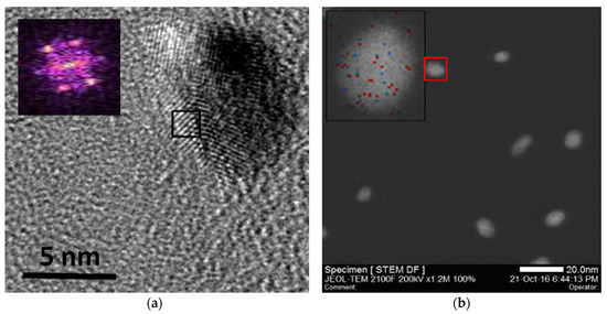 Figure 3c presents two 5-nm AuAg SPNPs exhibiting a face centered cubic (fcc) arrangement of atoms. This was confirmed by studying their crystal lattice shown in Figure 4a, and the corresponding fast Fourier transform (FFT) pattern displayed in the inset. Energy-dispersive X-ray spectroscopy (EDX) elemental mapping performed in HRSTEM (Figure 4b) and the corresponding elemental analysis (Figure 4c) of the nanoparticles confirmed not only the bimetallic nature of these SPNPs (with compositions around 68% of Au and 32% of Ag), but also their homogeneous composition distribution, with an average composition distribution of %Ag/%Au = 0.48 and a standard deviation of 0.02, which is an order of magnitude lower than previous results obtained by means of a gas-phase process without pre-alloyed sources [32].