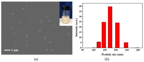The enzyme-catalyzed polymerization of phenol in water is a typical precipitation polymerization. During polymerization, the powdery polymer precipitates from solution [34]. Serving as the core material, PP is expected to exhibit stability in water and controlled size. Thus, the polymerization was directly performed in water without solvents or buffer solution. We found that a homogeneous emulsion was formed by controlling the molecular weight of PEG. Different molecular weights of PEG, from 400 g/mol to 4000 g/mol, were used in the enzyme-catalyzed polymerization. The as-prepared emulsions were kept for several weeks, and the emulsion prepared with PEG 2000 showed the best stability. Thus, PEG 2000 was selected for the preparation of PP@TiO2 core–shell nanosphere. The morphology and particle size distribution of PP were analyzed by SEM and DLS. The SEM image is shown in Figure 1a. It was clear that PP particles presented a uniform spherical structure with a smooth surface and a diameter of about 180 nm. The optical photograph of the PP emulsion was a little brown and remained stable for several weeks (inset of Figure 1a). The size distribution curve (Figure 1b) from DLS analysis demonstrates that the PP presented as uniformly dispersed particles with size ranging from 120 nm to 250 nm, and the average size was 174 nm.