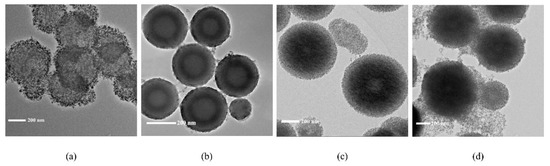 TEM was further used to observe the structure of the nanospheres, as shown in Figure 4. In the sample of PP@TiO2-25, a strong contrast between the dark edges and gray centers indicated the core–shell structure of the nanosphere. The PP nanoparticles were covered by an aggregation of TiO2 particles, and the thickness of the shell was about 30 nm. With the increase in TBOT amount, the thickness of the shell apparently increased and the size of the core of PP greatly reduced. The nanosphere prepared with 50 μL of TBOT showed a shell thickness of about 80 nm and a core diameter of about 150 nm. The shell thickness of the nanosphere prepared with 75 μL of TBOT was about 200 nm, and the core diameter was below 120 nm. With 100 μL of TBOT, the size of the core reduced to 50 nm with a shell of 280 nm. The results indicated that TBOT permeated into the core region when the amount of TBOT was high.