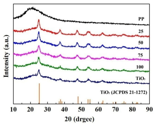 The X-ray diffraction (XRD) total pattern in Figure 5 was used to study the microstructure of the PP@TiO2 nanospheres. The typical X-ray diffraction spectrum of amorphous polymer is shown at 2θ = 20°. The XRD patterns of the PP@TiO2 nanospheres showed apparent diffraction peaks at the 2θ values of 24.9°, 37.5°, 47.5°, 54.1°, and 62.4° that were indexed to the (101), (004), (200), (105), (211), and (204) planes, matching well with the anatase TiO2 JCPDS card (no. 21-1272) [40]. A pure TiO2 sample was prepared via the same sol–gel and hydrothermal process as PP@TiO2. Comparing the diffraction peak of PP@TiO2-25 to pure TiO2, it was obvious that the peaks became narrow and the intensities increased. This indicates that PP can improve the crystallinity of TiO2, which is very beneficial for an improvement in the catalytic activity. However, the effect was gradually weakened when the TBOT amount increased. As the TBOT amount was increased to 100 μL, the pattern resembled that of pure TiO2.