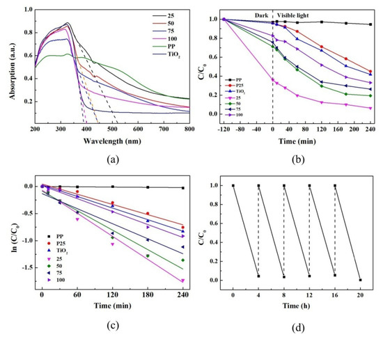 The optical absorption of PP@TiO2 nanospheres was characterized by UV–visible spectra, as shown in Figure 7a. PP had a broad absorbance from 400 nm to 800 nm. Meanwhile, pure TiO2 showed a narrow absorption edge located at 389 nm with a band gap of 3.19 eV, which is consistent with the intrinsic bandgap absorption of anatase TiO2. When PP was composed with TiO2, it was obvious that all the samples extended their absorbance edges to the visible-light region, and the TiO2 amount significantly affected the optical property of visible-light absorption. PP@TiO2-25 had the strongest and longest absorbance edge of 520 nm, corresponding to a band gap of 2.38 eV. The curve of PP@TiO2-25 was similar to that of PP from 400 nm to 800 nm. This indicated that the shell of PP@TiO2-25 had no apparent hindrance of the visible-light absorption of PP. However, the absorbance of visible light of PP@TiO2 nanospheres gradually decreased with increased amount of TiO2. The absorbance edge of PP@TiO2-100 reduced to 400 nm, and its band gap rebounded to 3.1 eV. This result demonstrated that the TiO2 shell blocked the visible-light absorption of the nanosphere when the thickness exceeded some threshold value. The obvious decrease in the bandgap of PP@TiO2 may be attributed to the chemical bonding between TiO2 and PP with the formation of C–O–Ti bonds. The narrow band gap and long absorbance edge were beneficial for improving the visible-light photocatalytic efficiency.