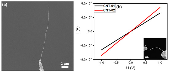 CuO is known as a good candidate for photovoltaic devices, catalysts, sensors, stable electron sources, and optoelectronic devices owing to its direct narrow band gap, ultrahigh electrocatalytic activity, and stability [36,37,38]. In this work, CuO nanowires were grown using the thermal oxidation method [39]. An individual CuO nanowire with a length of about 4.5 μm and a diameter of ~43 nm, which was welded on the top of a tungsten needle, is shown in Figure 6a, which indicates that the CuO nanowire may have a large resistance. The above idea was confirmed by the I‒V curve in Figure 6b. The resistances at a lower voltage range were calculated to be about 1.9 and 3.9 GΩ, respectively, indicating that Ohmic contacts were formed between the CuO nanowires and the tungsten needle.