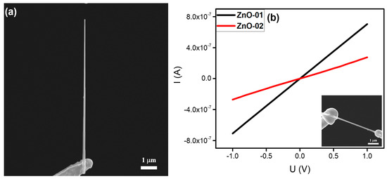 At present, ZnO is one of the most important nanomaterials in nanotechnology research, owing to its relatively low production cost, direct wideband gap energy (3.37 eV), and superior optical properties [30,31,32]. In this work, ZnO nanoneedles were commercially obtained from the Jiangsu XFNANO Materials Tech Co. Ltd. As shown in Figure 4a, the sample had a tapered structure with a length of about 9 μm, a top diameter of ~70 nm, and a root diameter of ~160 nm. Furthermore, it presented good alignment relative to the substrate. The in-situ electrical measurement results on individual ZnO nanoneedles are shown in Figure 4b. The current increased linearly as the voltage was increased from −1 to +1 V. The calculated resistances were about 1.4 and 3.7 MΩ, respectively, indicating that good Ohmic contacts had been established between the ZnO and tungsten needles.