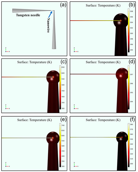 For the SiC nanowire, the resistance limited by its low electrical conductivity was much larger than that of the LaB6 nanowire. To obtain large enough electrical current flowing through the welded joints, the voltage of the external circuit had to be increased accordingly. However, the imaging effect of SEM is be affected when the voltage applied to the tungsten needle is too high. Therefore, to ensure that the e-beam was irradiated at the contact area by SEM imaging, the voltage of the external circuit had to be limited to 50 V. For the high-resistance SiC nanowire, the maximum current could only reach about 1 μA. Figure 8e shows the simulation results of the SiC nanowire near the welded joint under the action of the e-beam radiation with a 5 μA electrical current. In this situation, the resistance of the SiC nanowire was low and the maximum temperature at the welded joint was more than 700 K. On the contrary, as shown in Figure 8f, the maximum temperature at the welded joint with the high-resistance SiC nanowire was lower than 380 K. It is noteworthy that the highest temperature of the whole welded structure no longer appeared at the welded joint but, instead, appeared in the middle area of the SiC nanowire. Combined with the previous results shown in Figure 5b, it can be seen that the welded joints preferred to form Ohmic contacts, rather than Schottky contacts, when the electrical current was higher.