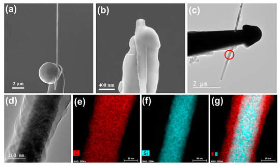 (a) SEM image of the individual SiC nanowire covered by an amorphous carbon layer at the welding area; (b) SEM image of the broken individual SiC nanowire welded onto the tungsten needle; (c) TEM image of the welded structure with low magnification; and (d) high-magnification TEM image of the area near the welding point marked by the red circle in figure (c). (e–g) energy-dispersive X-ray spectroscopy (EDX) mapping images: (e) carbon element distribution in the SiC nanowire; (f) silicon element distribution in the SiC nanowire; and (f) mixed silicon and carbon element distributions in the SiC nanowire.