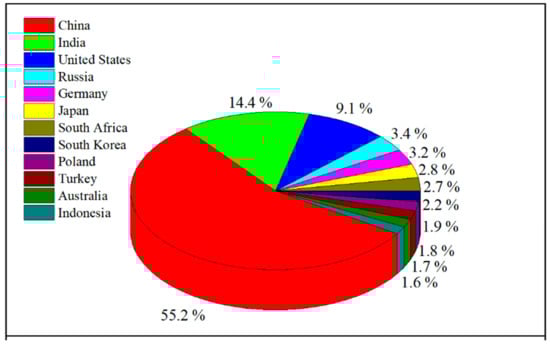 Global coal consumption rose with 0.9% in 2018, the main contributors being India and China, followed by Turkey and Russia [] (Figure 1). Due to power plants and some industrial sectors (such as steel, chemicals and cement) China is responsible for approximately half of global coal consumption [], this value reaching about 3770 Mt, which represented 55% of the worldwide consumption in 2018, approximately four times higher than in 1990 [].