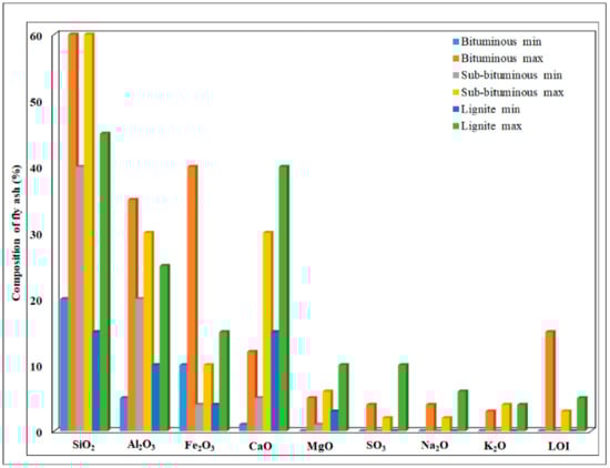 As it is shown in Figure 4, the content of metallic oxides in fly ash is depended by the coal type. Thus, the SiO2 contents were higher in the fly ash derived from sub-bituminous (40%–60%) and bituminous (20%–60%) samples than in lignite samples (15%–45%). The same trend was seen for Al2O3. In the case of CaO and MgO higher contents were observed in fly ash from lignite samples (15%–40% and 3%–10%, respectively), followed by sub-bituminous samples.