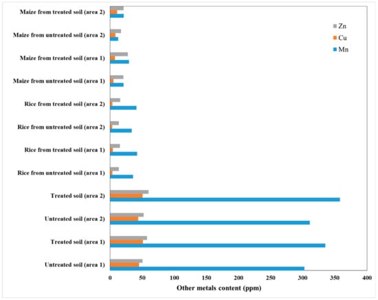As it can be seen from Figure 5, the soil enrichment with heavy metals in rice crops did not exceed the upper control limits (in soil: 1500 ppm for Mn, 100 ppm for Cu and 300 ppm for Zn; in plant: 300 ppm for Mn, 50 ppm for Cu and 100 ppm for Zn) [,,]. Thus, the soils treated with fly ash presented a slight enrichment with microelements, such as Zn, Mn and Cu, which are essential for plant growth. Also, the enrichment of rice and maize crops with microelements was observed. In the case of rice crops, the enrichment with Cu was lower than with Zn and Mn.