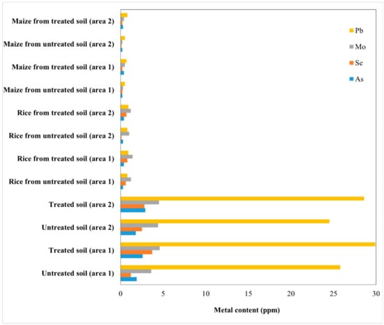 It was also demonstrated that the soil treated with fly ash contributed to the increase of crop yields, by the action of essential plant nutrients, such as Mg, S, K, Ca, Mn, Fe and Zn []. The fly ash can modify the physical properties of the soil, such as porosity and density, increasing the water retaining capacity [,]. Due to low concentration of toxic elements in fly ash, the critical levels were not reached and the grains were considered safe for consumers.