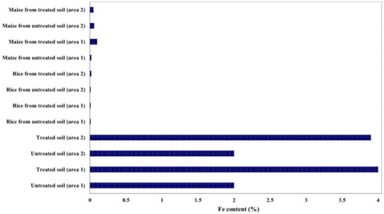 It was observed that Fe was the major element. As it can be seen in Figure 7, there are significant differences between the enrichment of Fe in crops from untreated and treated soils (upper control limit for Fe being 5.6% in soil and 0.2% in plant).