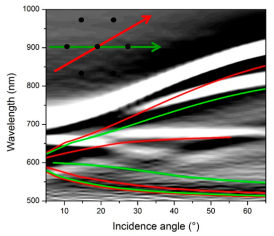 Second derivative of the spectral reflectance plotted as a function of the incident angle. The bright and dark signals correspond to minima and maxima in the reflectance spectrum, respectively. The superimposed red and green lines correspond to the calculated plasmonic dispersion for two orientations of the hexagonal lattice.
