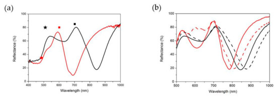 (a) Reflectance spectra for two gratings having lattice pitch of 500 nm (black line) and 400 nm (red line). The stars and the squares point out the calculated gold/air and gold/glass polariton wavelength, respectively. (b) Solid black and red lines correspond to the reflectance spectra recorded for two gratings having the same lattice pitch (500 nm) but different hole size. Dashed lines show the spectra acquired for the two samples when water is dispensed on the grating surface. These graphs are obtained from unpublished data from the authors.