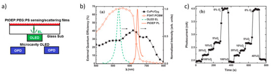 Organic light emitting diode (OLED)-based light sources are robust, portable, miniaturized, cost-effective and fast [50,51]. In addition, thanks to their soft-mechanical and chemical nature, and their low dimension, OLEDs can be easily interfaced with biological and environmental systems, while minimizing their perturbation, and they can be easily integrated into industrial value chains allowing for a real in-line and on-line process control.