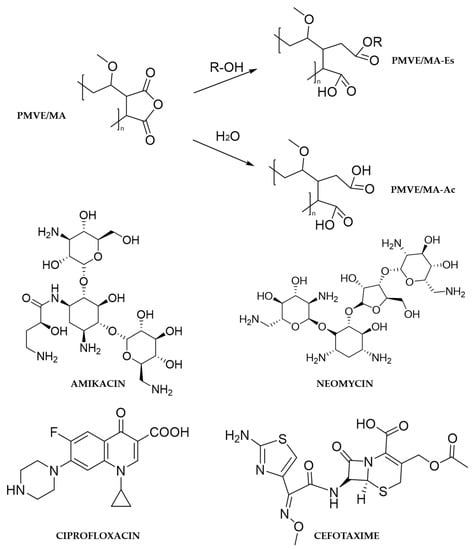 - Mira, A.; Mateo, C.R.; Mallavia, R.; Falco, A. Poly (methyl vinyl ether-alt-maleic acid) and ethyl monoester as building polymers for drug-loadable electrospun nanofibers. Sci. Rep. 2017, 7, 17205. [Google Scholar] [CrossRef] [PubMed]