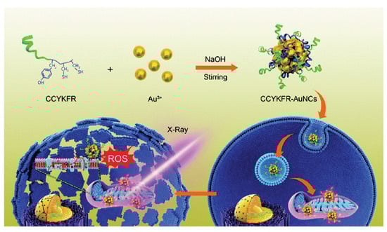 Enhanced radiosensitivity of cancer cells by gold nanoclusters (AuNCs) with mitochondria targeting. Peptide-templated AuNCs were synthesized through a green synthetic route, featured with highly efficient co-localization onto mitochondria after endocytosis. Under 4 Gy X-ray irradiation, peptide (CCYKFR)–AuNCs can introduce the burst of mitoROS and cell death. Reproduced with permission []. Copyright The Royal Society of Chemistry, 2017.