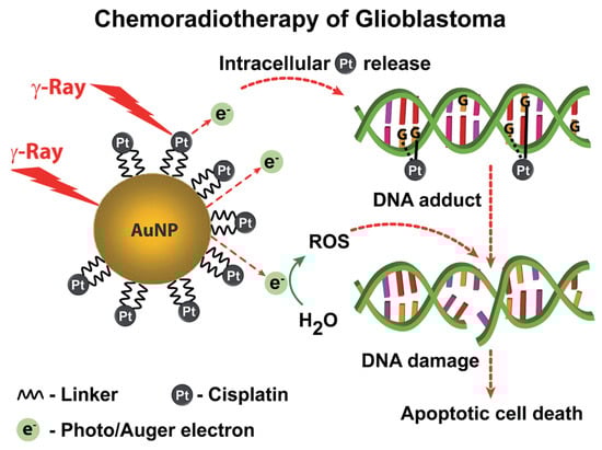 Multifunctional nanosphere for combined chemo-radiotherapy. Principle of nanosphere action based on gold and platinum mediated radiosensitization and cisplatin induced genotoxic damage. Reproduced with permission []. Copyright The Royal Society of Chemistry, 2014.