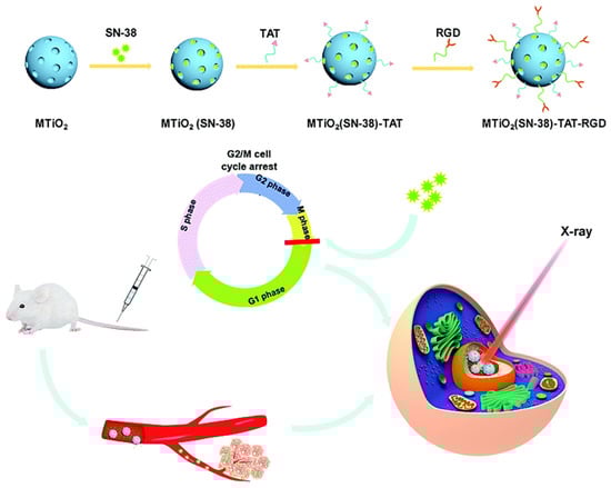 Preparation of MTiO2(SN-38)- transactivator of transcription (TAT)-Arg-Gly-Asp (RGD) nanoparticles (NPs) and its application for enhanced radiotherapy. Reproduced with permission []. Copyright The Royal Society of Chemistry, 2019.