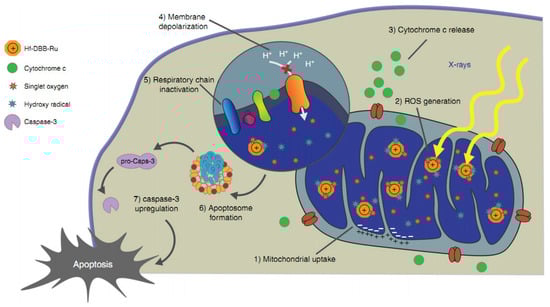 Mitochondria-targeting NPs exhibited excellent radiosensitization effects. Peptide (CCYKFR)-templated Au nanoclusters (AuNCs, 3 nm) efficiently targeted mitochondria in human breast cancer MCF-7 cells. CCYKFR–AuNCs irradiated by 4 Gy of X-rays elicited a burst of mitochondrial ROS, resulting in cancer cell death (Figure 1) []. In another study, a mitochondria-targeted nanoradiosensitizer was constructed by covalently attaching mitochondria targeting triphenylphosphine (TPP) groups to TiO2-Au NPs. When irradiated with X-rays, TiO2-Au-TPP NPs (18 nm) triggered ROS production in mitochondria, caused a decrease in mitochondrial membrane potential, and induced the death of MCF-7 cells. In a MCF-7 and 4T1 tumor-bearing Balb/c mouse model, TiO2-Au-TPP dramatically improved the therapeutic efficacy of radiotherapy [].
