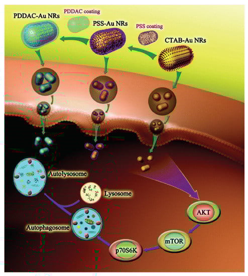 The surface charge can regulate the autophagy level. The positively charged cetyl trimethyl ammonium bromide (CTAB)-GNRs promoted the transformation of LC3-I to LC3-II in HCT116 cells, while the negatively charged polystyrene sulfonate gold nanorods ((PSS)-GNRs) did not significantly enhance the autophagy level []. Similarly, CTAB-GNRs (55 × 14 nm) induced AKT-mTOR-dependent autophagy by inducing LC3-II conversion and p62 degradation in A549 cells. However, PSS-GNRs did not induce autophagy (Figure 5) []. NH2-GQDs (3.5–5 nm) induced autophagy in A549 cells, as proven by LC3-II conversion and autophagosome accumulation; however, negatively charged COOH-GQDs did not enhance autophagy levels []. COOH-SWCNTs induced the autophagic cell death of A549 cells, however, PEG decoration inhibited autophagy [].