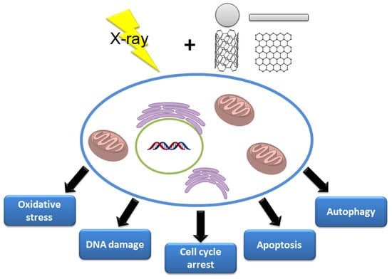 Due to their outstanding physicochemical properties, nanoparticles (NPs) are widely used in various fields, including the consumer product, energy, and biomedical fields [,,,]. Various kinds of NPs have been found to sensitize cancer cells to radiotherapy due to their intrinsic radiosensitive action and loading capacity for drugs and siRNAs []. Moreover, in vitro and in vivo experiments have demonstrated that NPs exhibit radiosensitization effects by regulating multiple biological mechanisms, such as oxidative stress, DNA damage, cell cycle arrest, apoptosis, autophagy, and hypoxia-related mechanisms [,,].