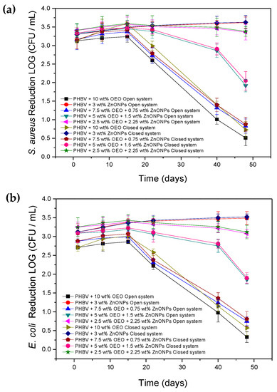 - Torres-Giner, S.; Hilliou, L.; Melendez-Rodriguez, B.; Figueroa-Lopez, K.J.; Madalena, D.; Cabedo, L.; Covas, J.A.; Vicente, A.A.; Lagaron, J.M. Melt processability, characterization, and antibacterial activity of compression-molded green composite sheets made of poly(3-hydroxybutyrate-co-3-hydroxyvalerate) reinforced with coconut fibers impregnated with oregano essential oil. Food Packag. Shelf Life 2018, 17, 39–49. [Google Scholar] [CrossRef]